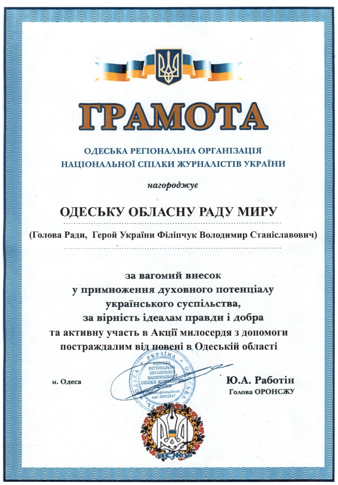 Українська Рада Миру щиро бажає всім людям доброї волі, Одеській обласній Раді Миру щастя, добра, сили і наснаги у всіх ваших справах, примноження внеску в утвердження миру та злагоди в Україні.