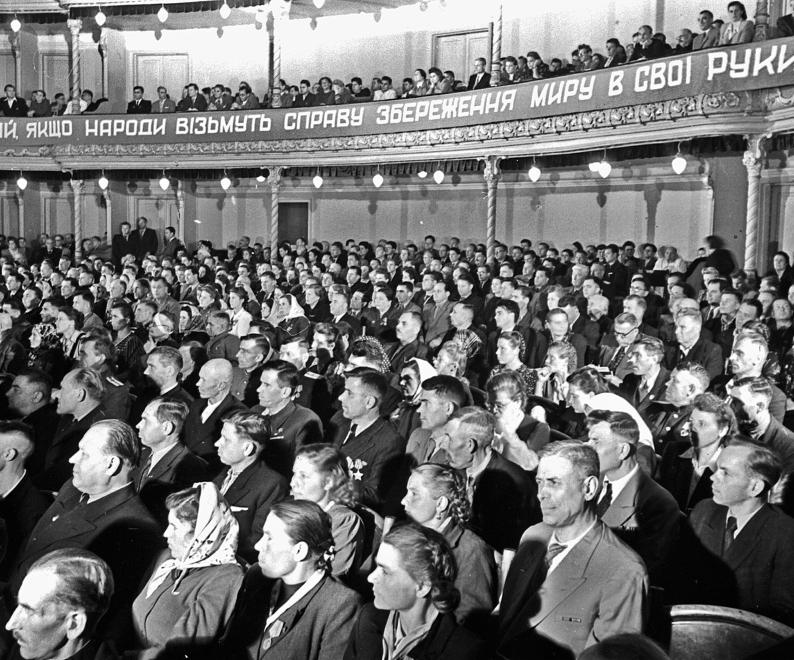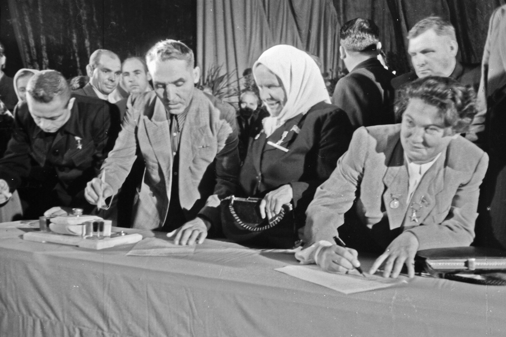 П. Ангеліна і О. Хобта разом з іншими делегатами Української республіканської конференції прихильників миру підписуються під Зверненням Всесвітньої Ради Миру про укладення Пакту миру між 5 Великими державами.