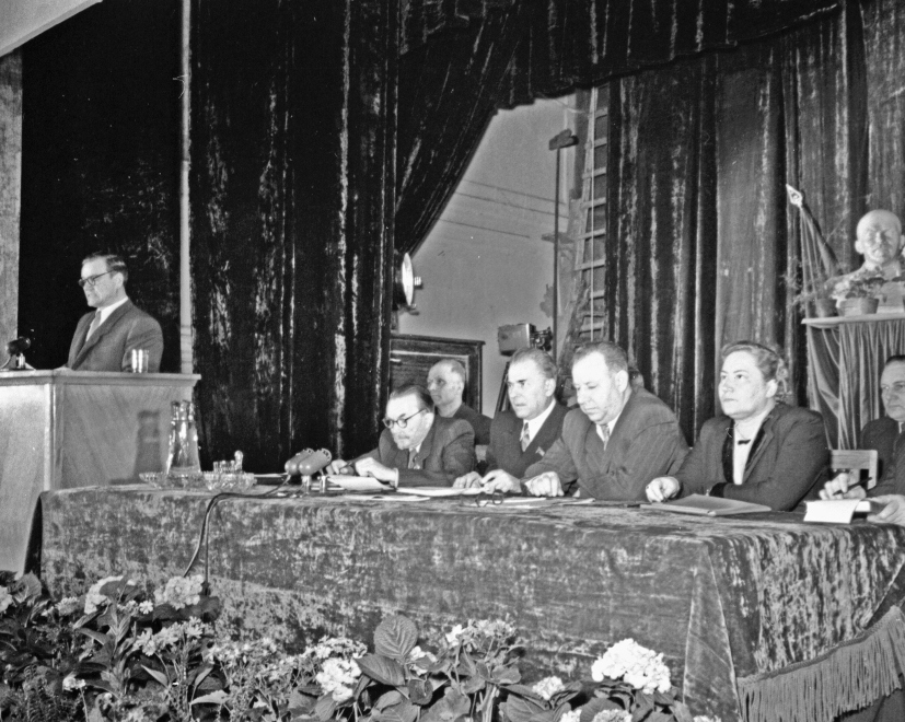 Віце-президент Академії наук УРСР М. Семененко виступає на 1-й Українській республіканській конференції прихильників миру.