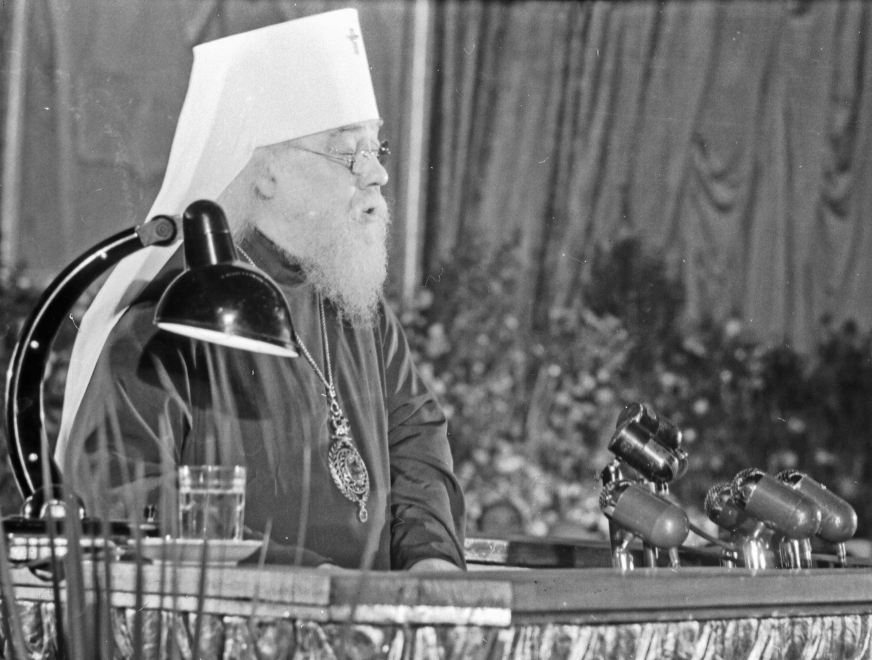 Екзарх України, митрополит Київський і Галицький Іоанн виступає на Українській республіканській конференції прихильників миру. 1951 р.